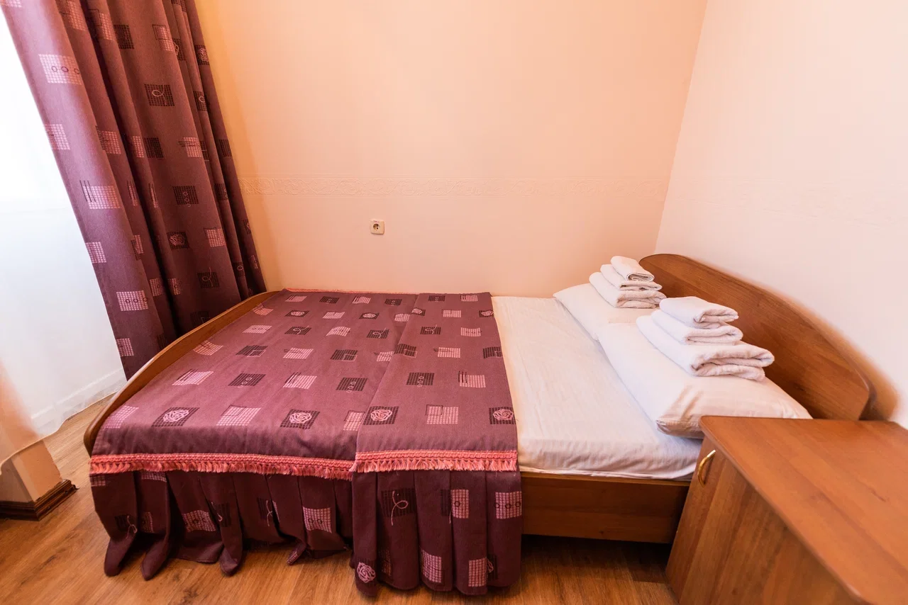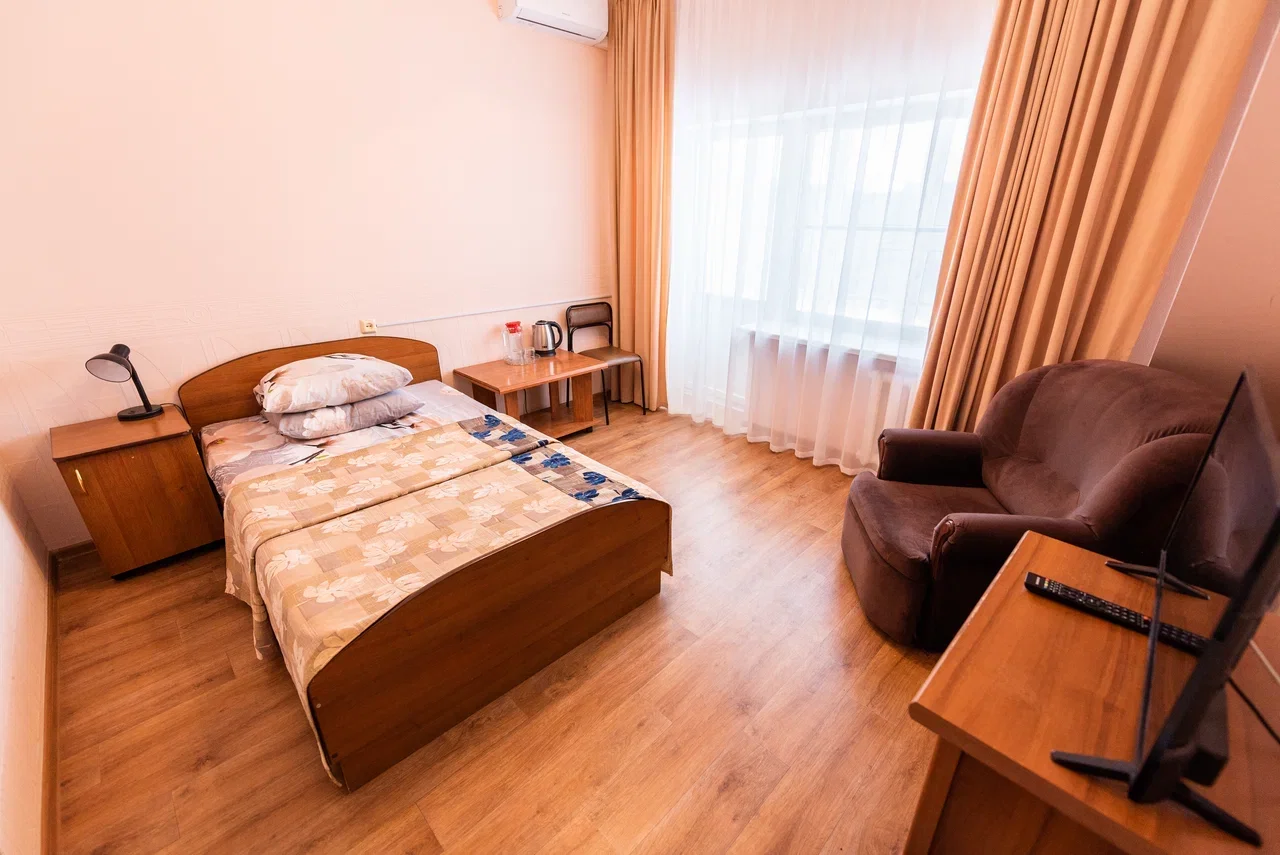 Оснащение номера: кровать двуспальная, прикроватная тумбочка, стол, стул, шкаф, телевизор, холодильник, чайный набор посуды, электрочайник